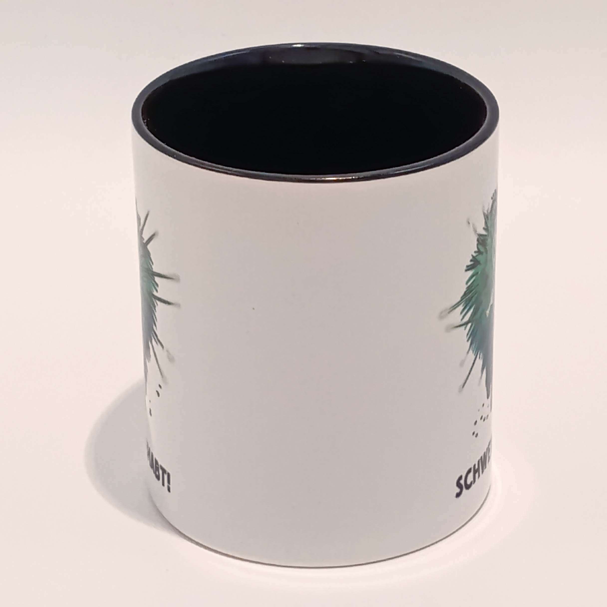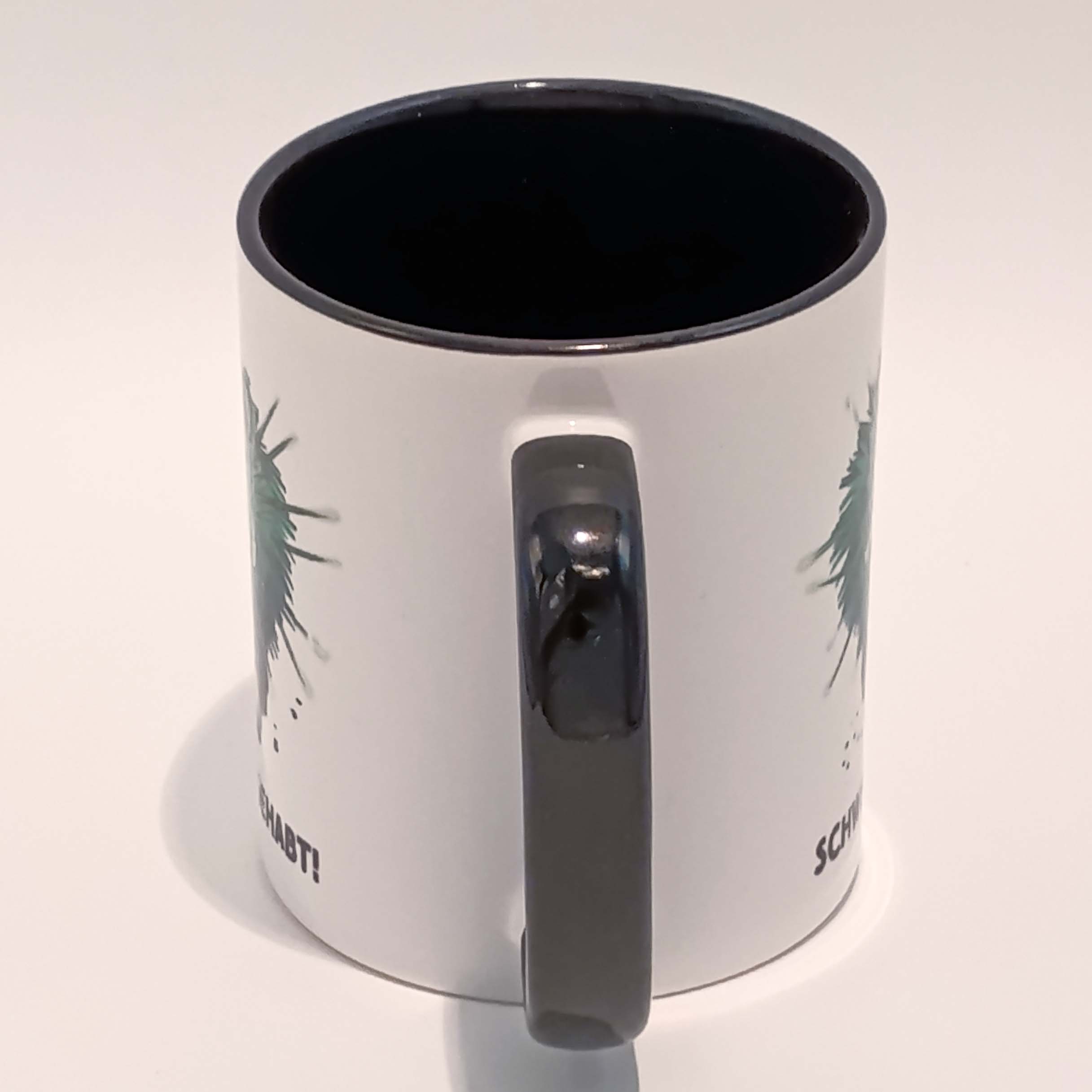 Das Motiv ist auf beiden Seiten der Tasse vorhanden. Der Hintergrund ist weiß und das Innere der Tasse sowie der Henkel sind schwarz.