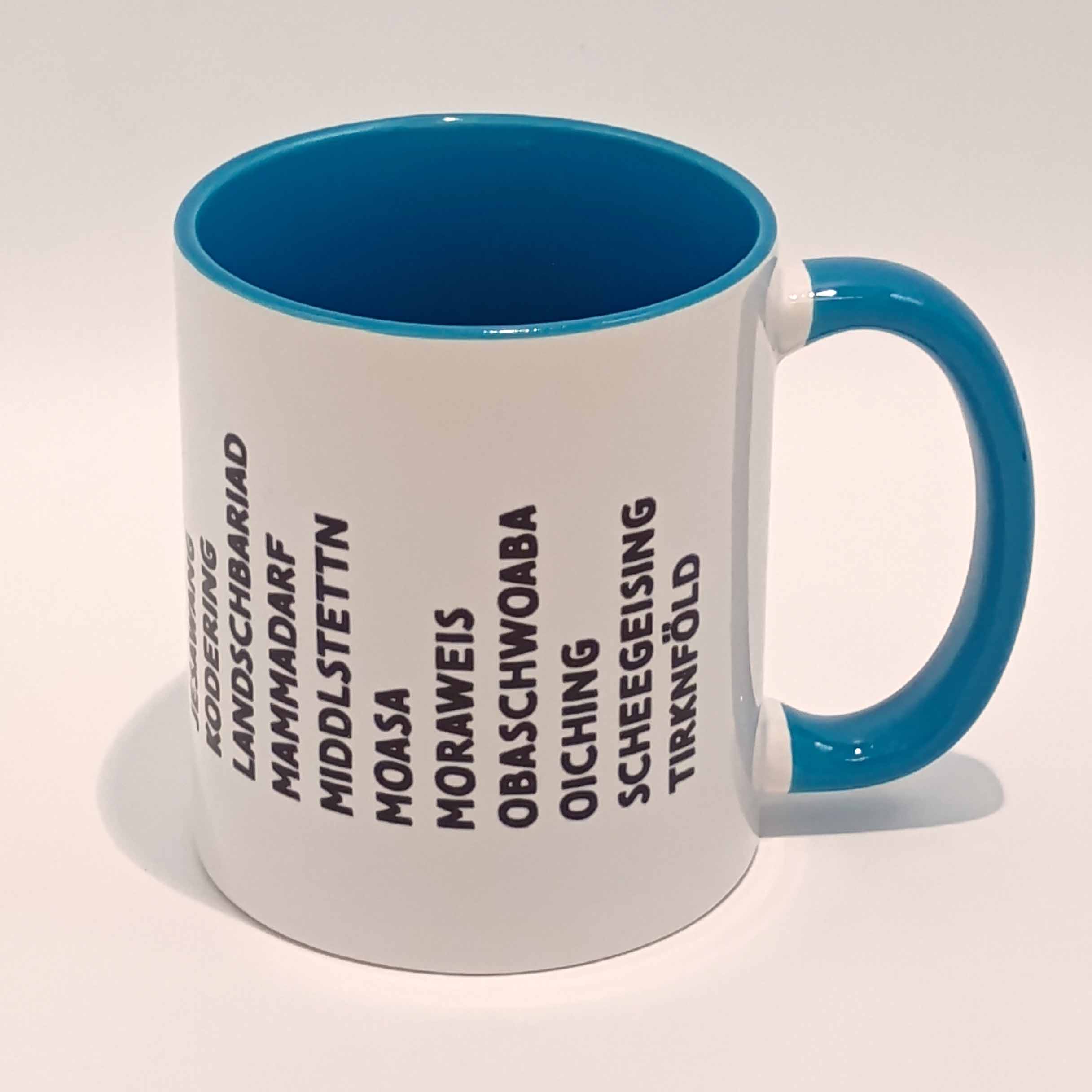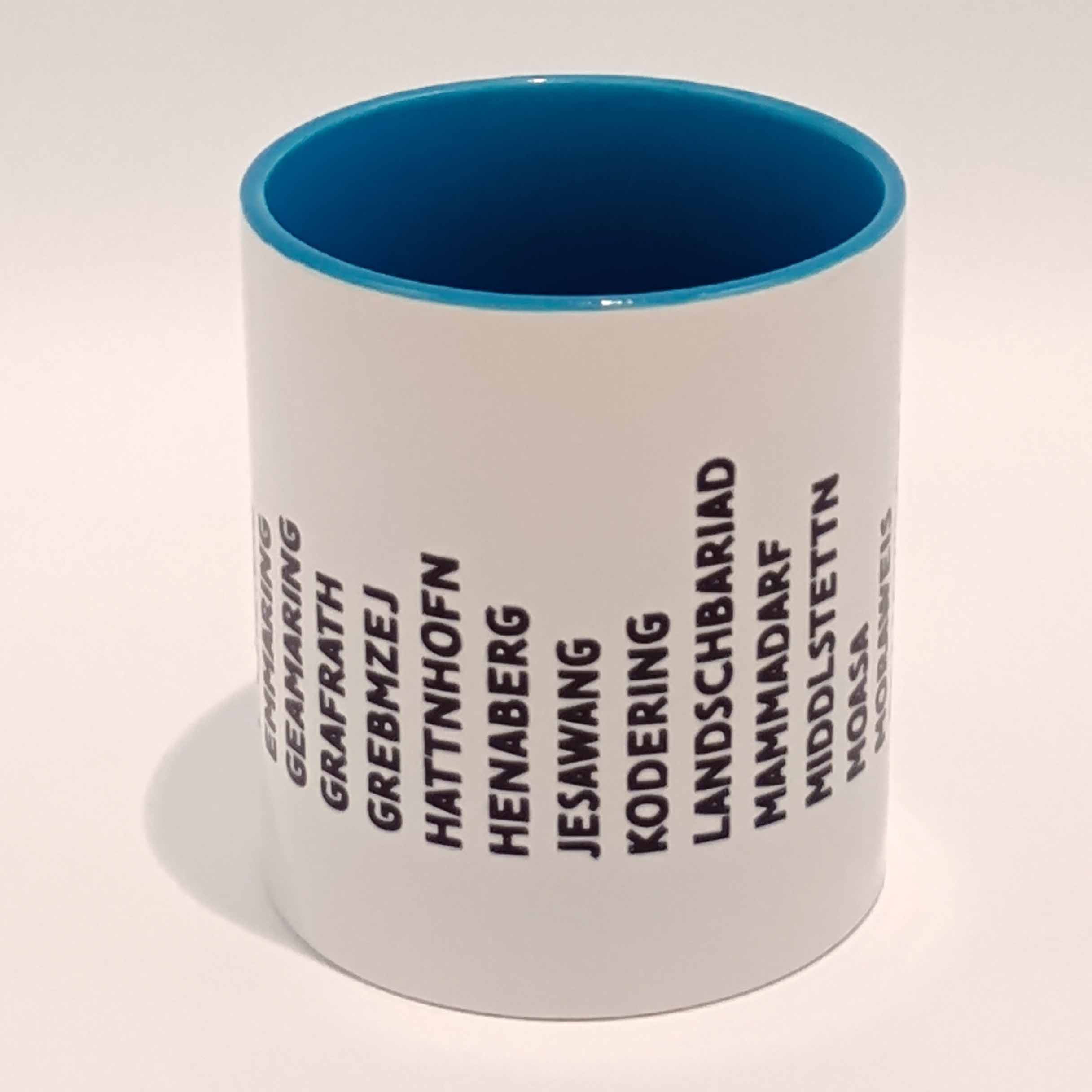 Eine hochwertige Tasse mit allen Ortsnamen des Landkreises Fürstenfeldbruck in der gängigen Aussprache.