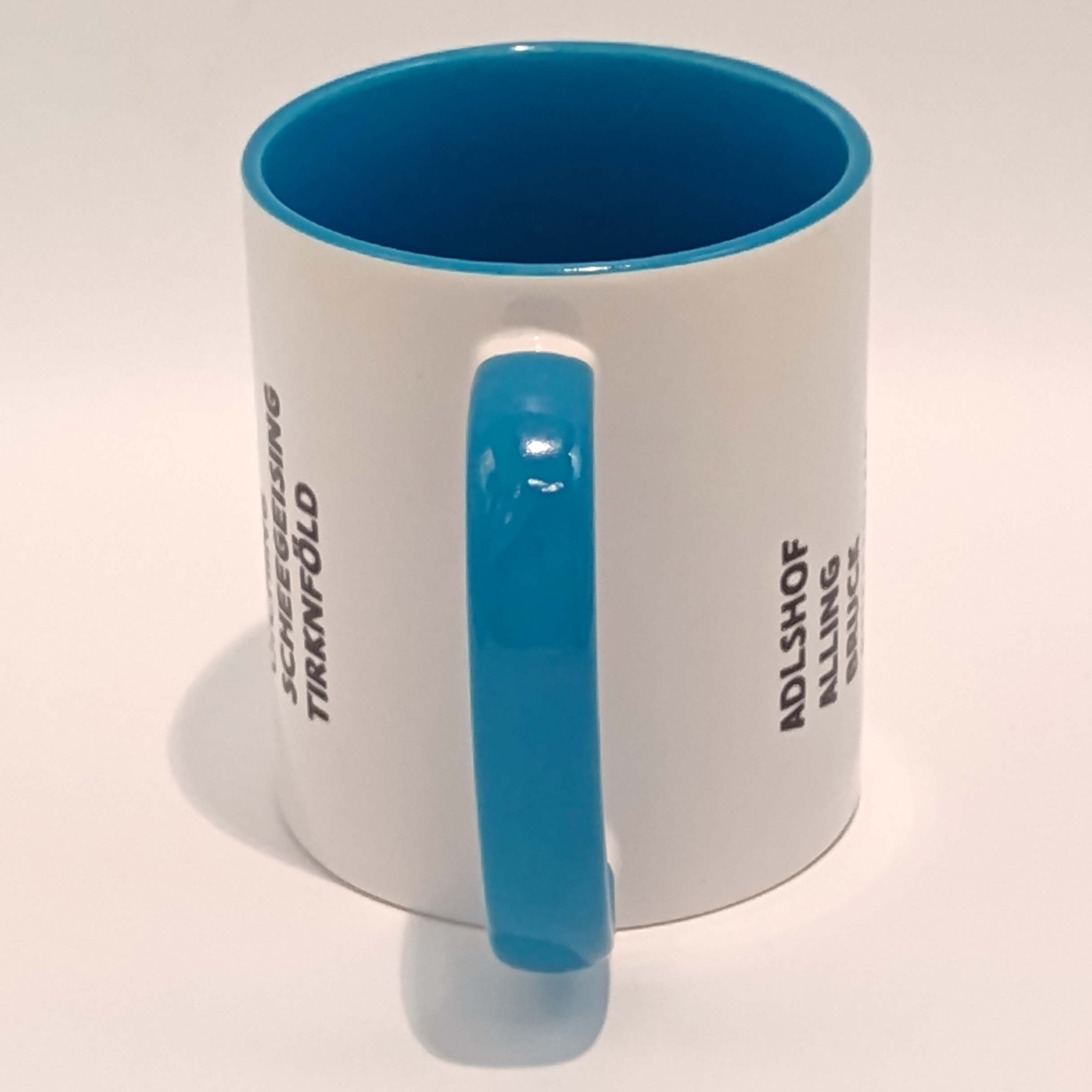 Die Schrift ist schwarz. Der Hintergrund ist weiß und das Innere der Tasse sowie der Henkel sind blau.