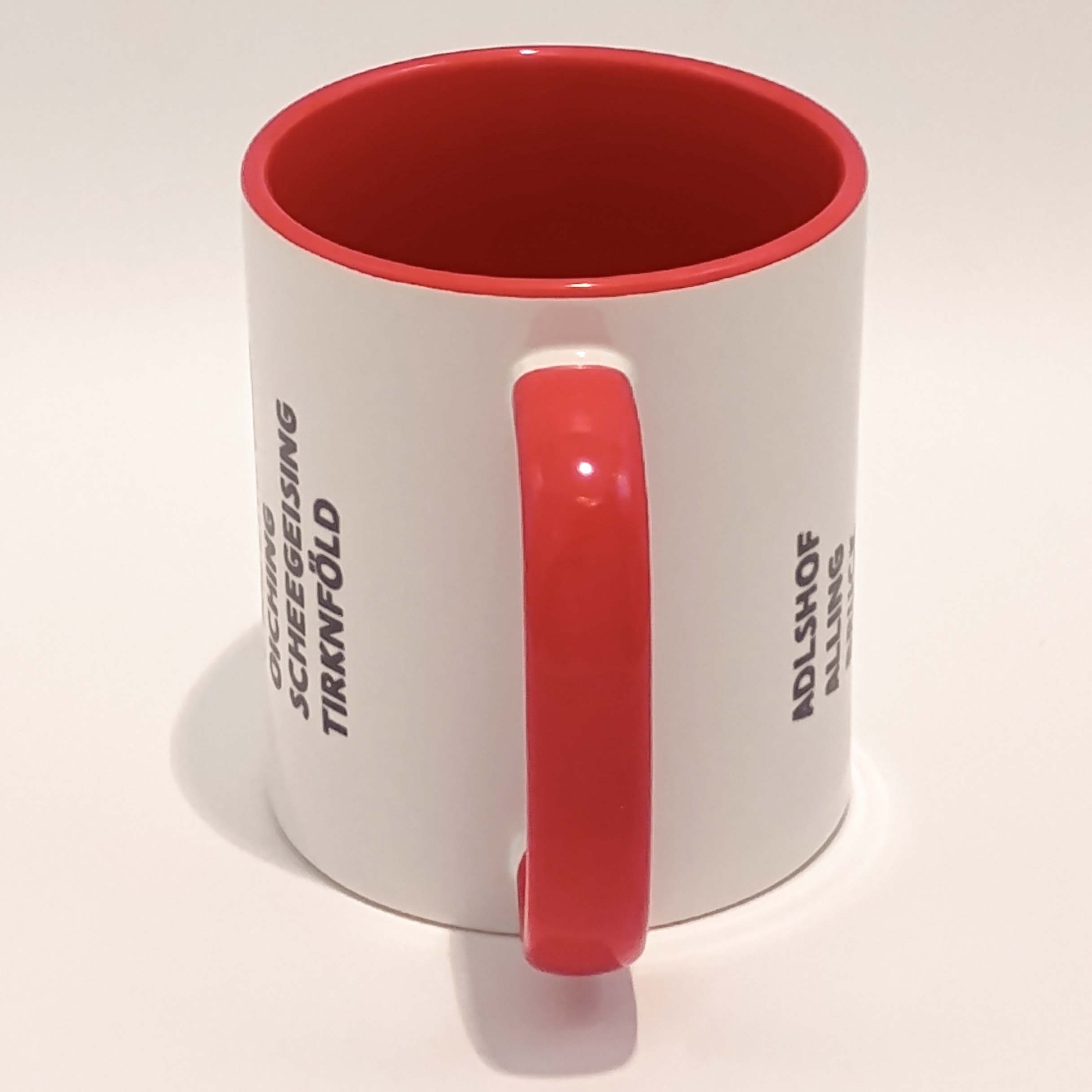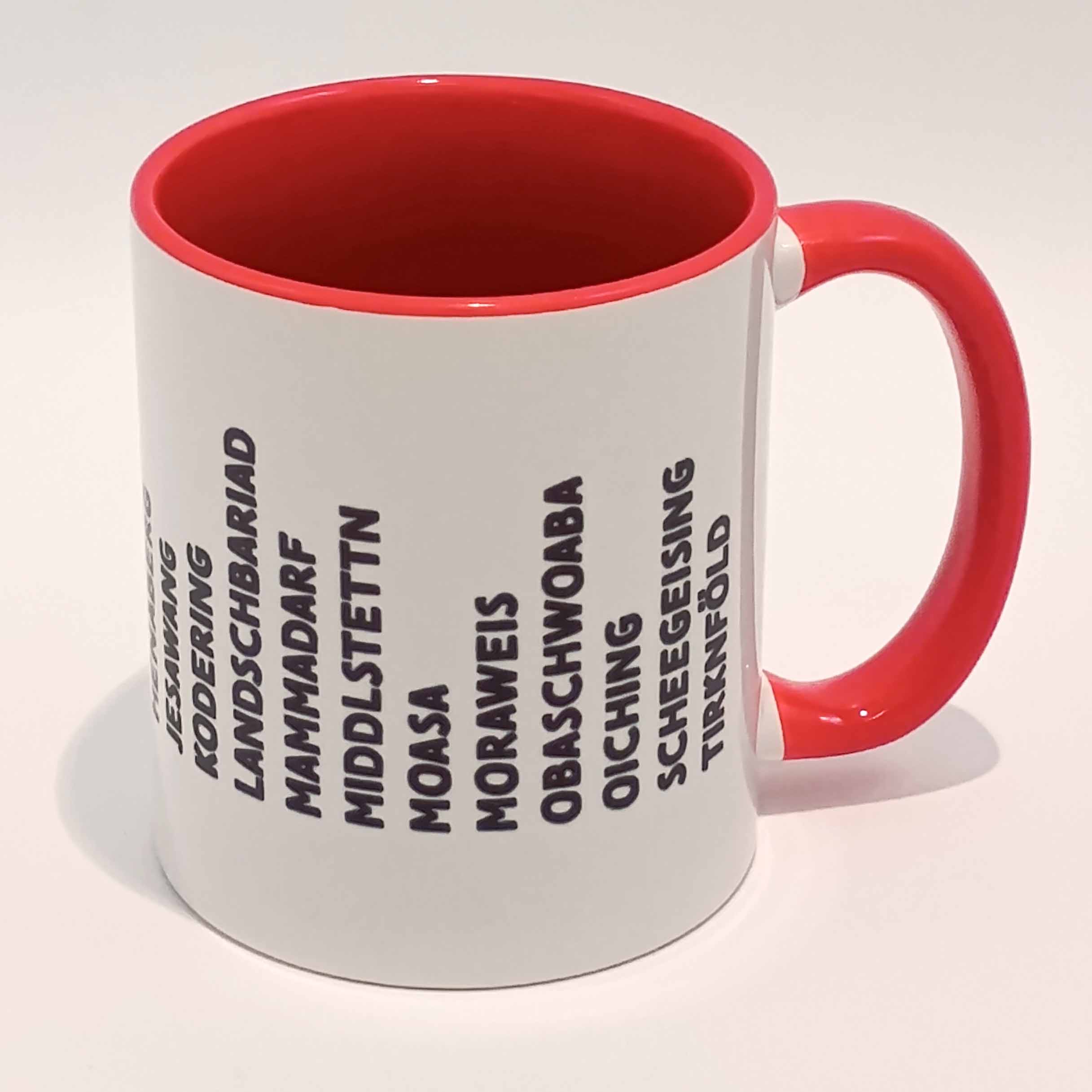 Eine hochwertige Tasse mit allen Ortsnamen des Landkreises Fürstenfeldbruck in der gängigen Aussprache.