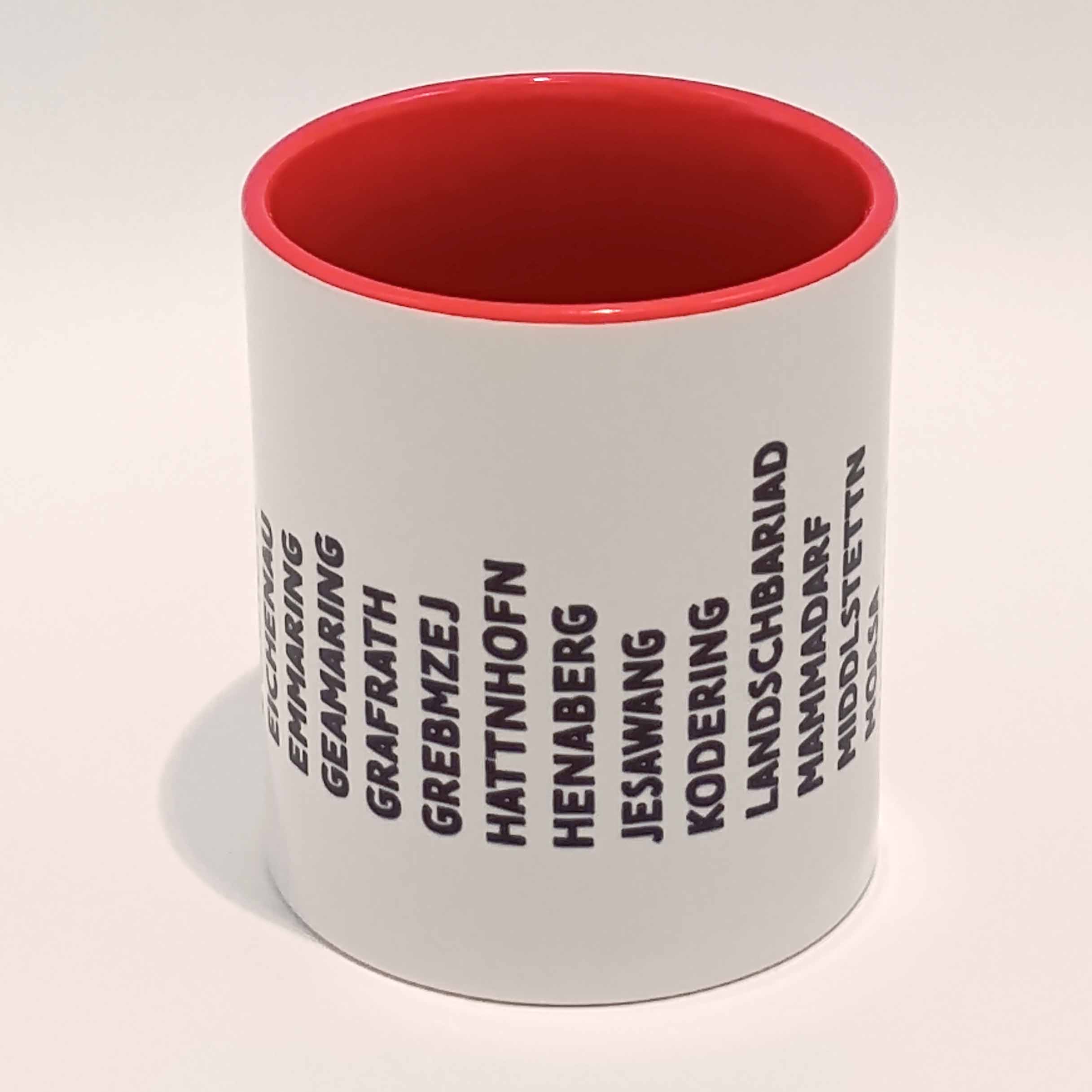 Eine hochwertige, in Deutschland bedruckte Tasse mit allen Ortsnamen des Landkreises Fürstenfeldbruck in der gängigen Aussprache.